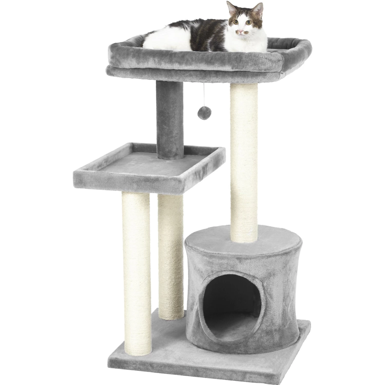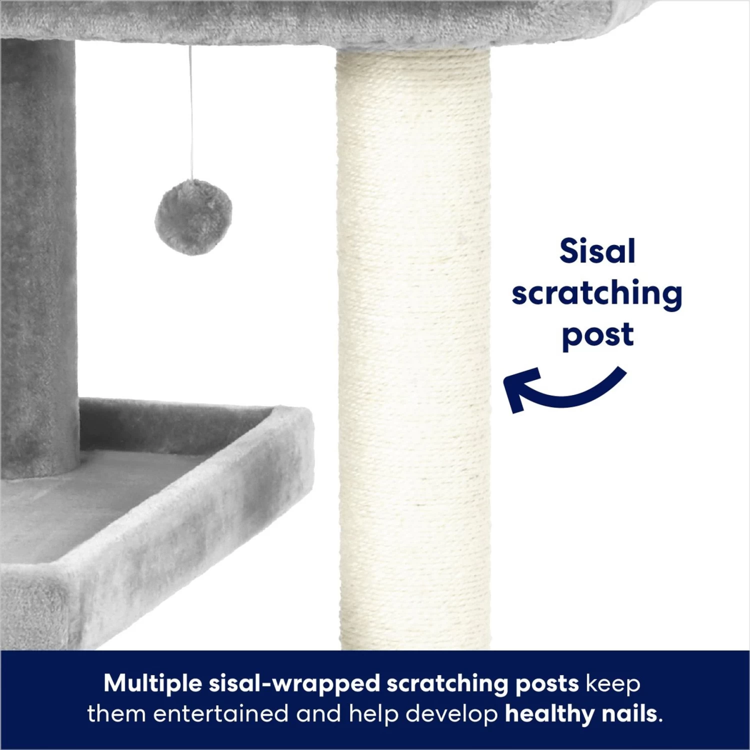 - From Frisco by Chewy. Three long scratching posts fully wrapped with rough, durable sisal rope for more satisfying scratching, plus built-in fluffy toys to attract their playful side.