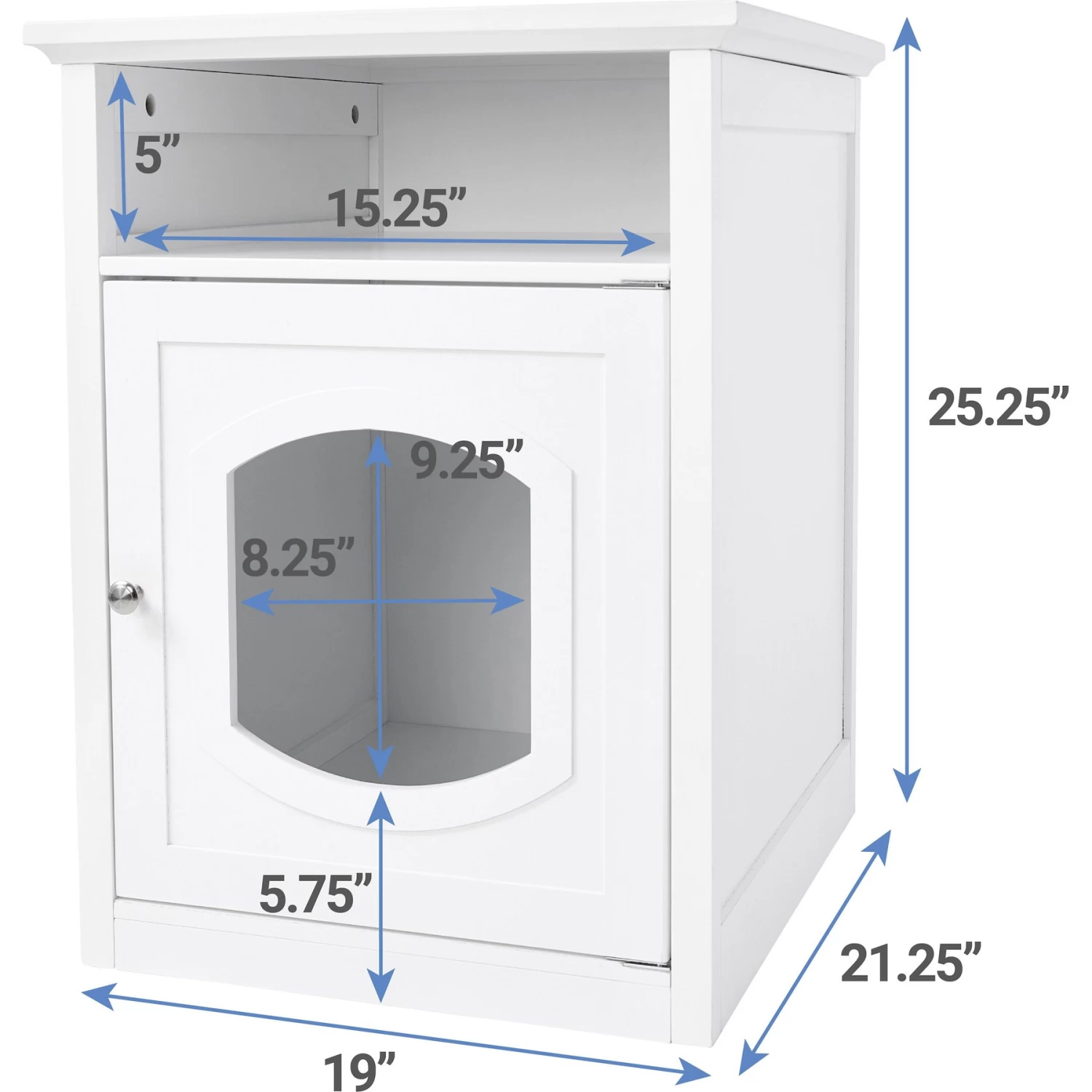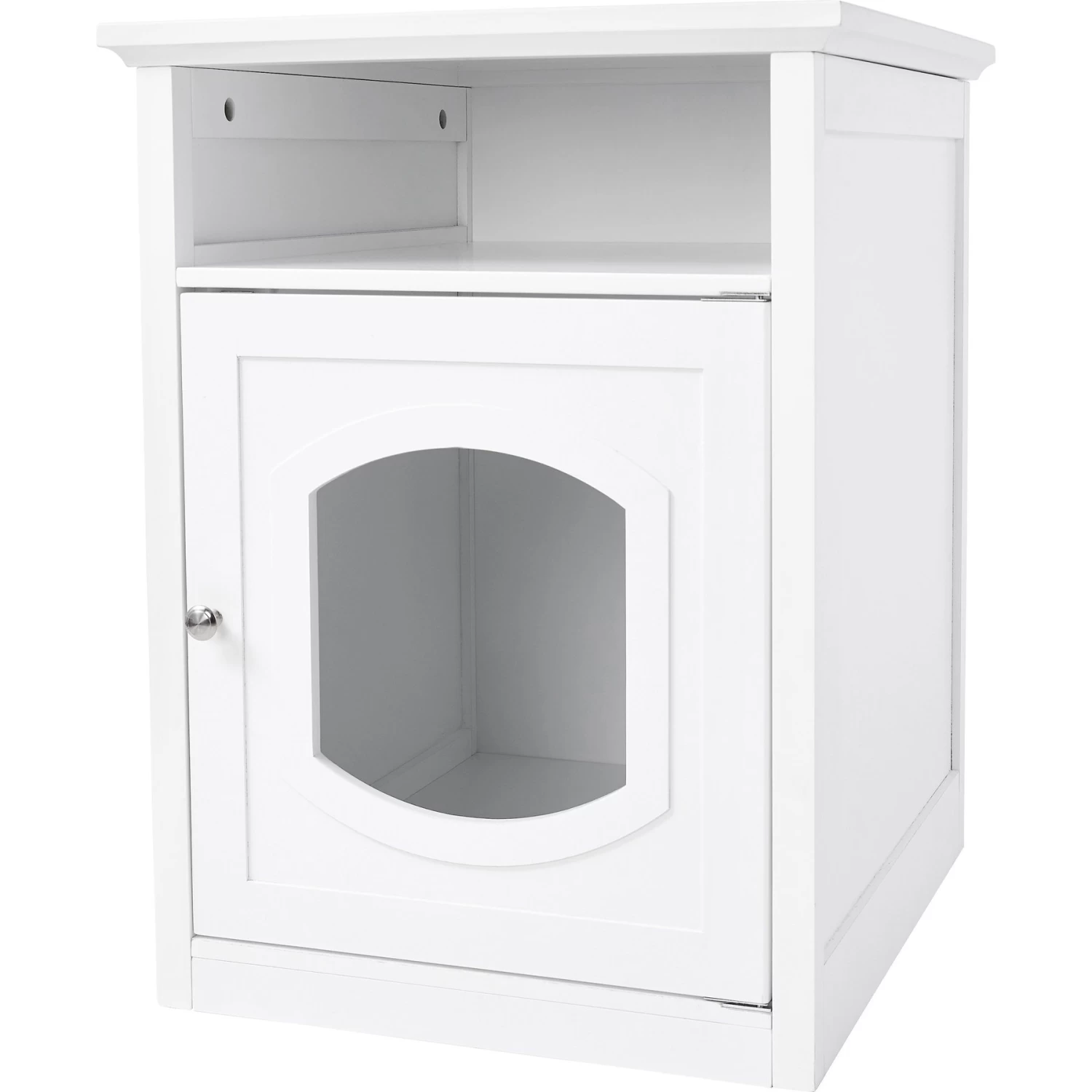 - Built-in door with hinges opens wide for easy access to your kitty’s condo or litter box spot.