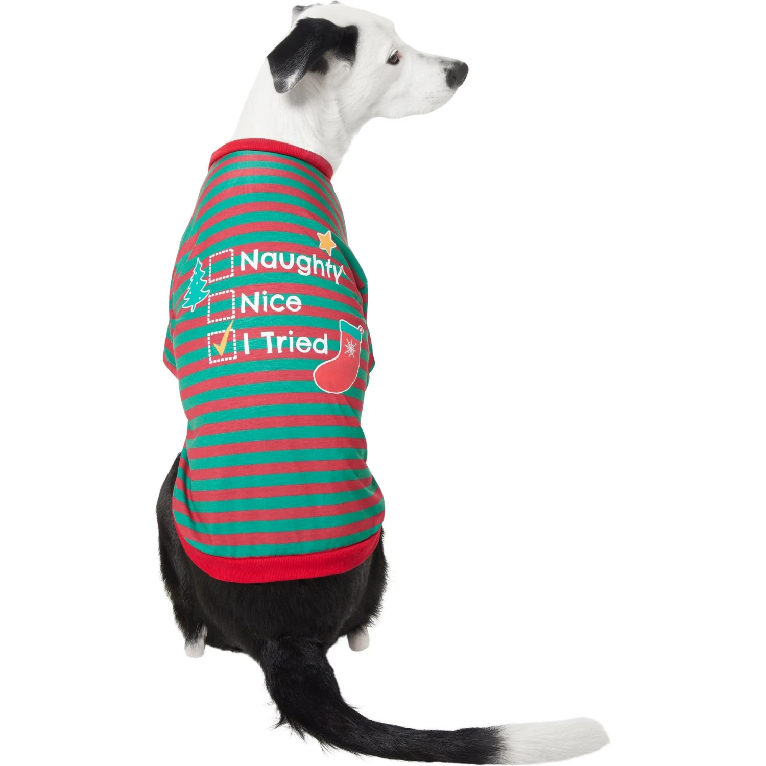 - From Frisco by Chewy. Red-and-green striped holiday shirt reads “Naughty, Nice, I Tried,” for a look that’ll make Santa consider revising his list.