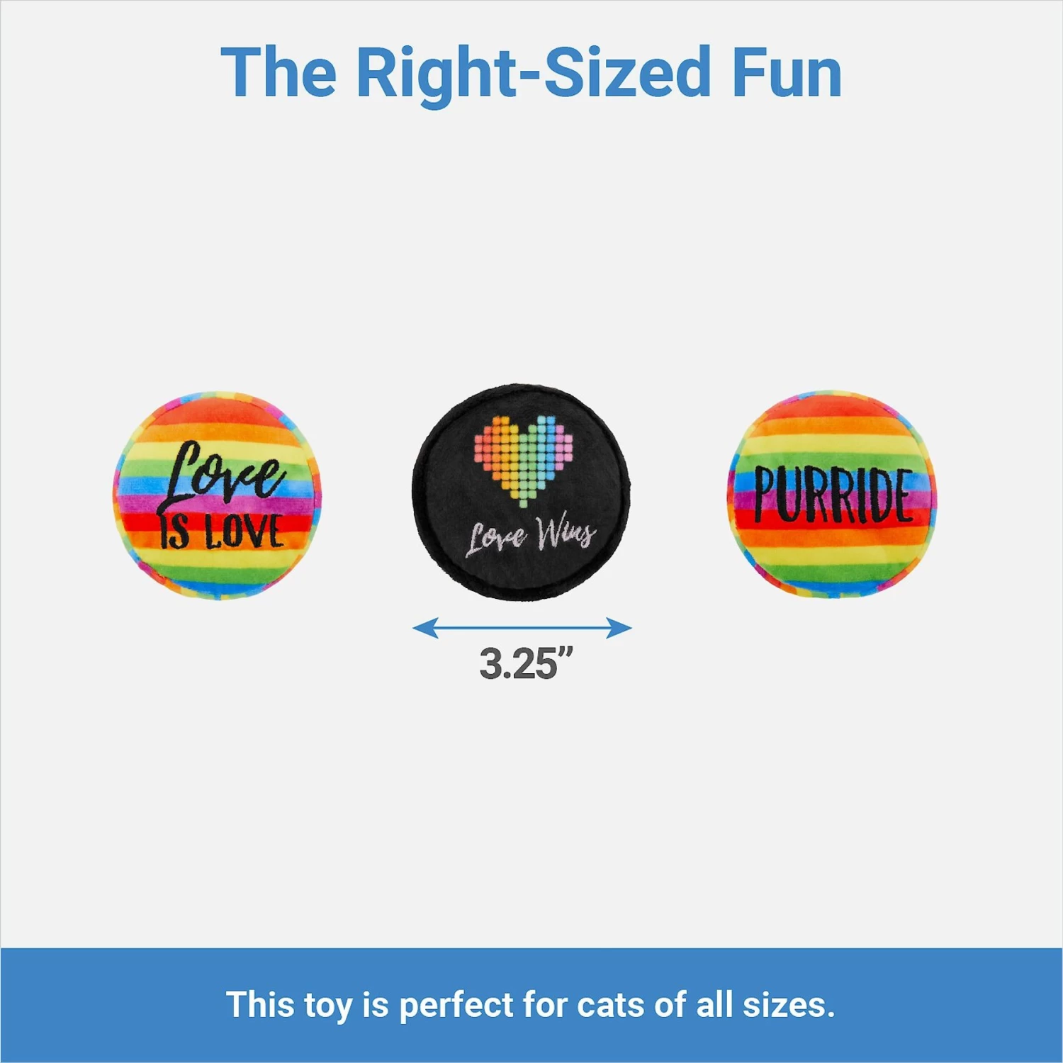 - Plush button set features three different toys, each with a different Pride message for your kitty.